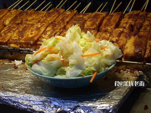 以下照片就是碳烤臭豆腐,有不同口味的泡菜可以當配菜。