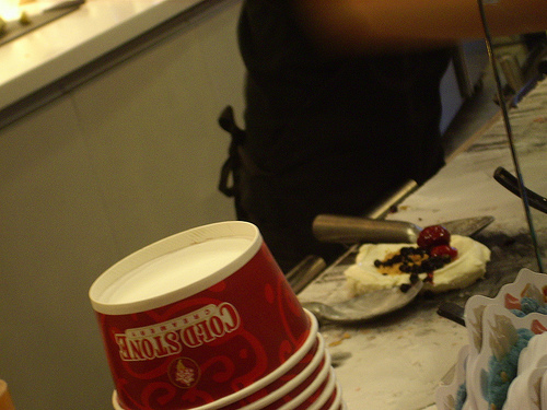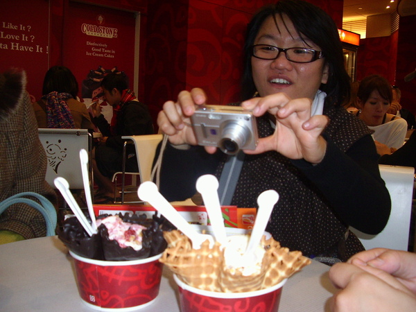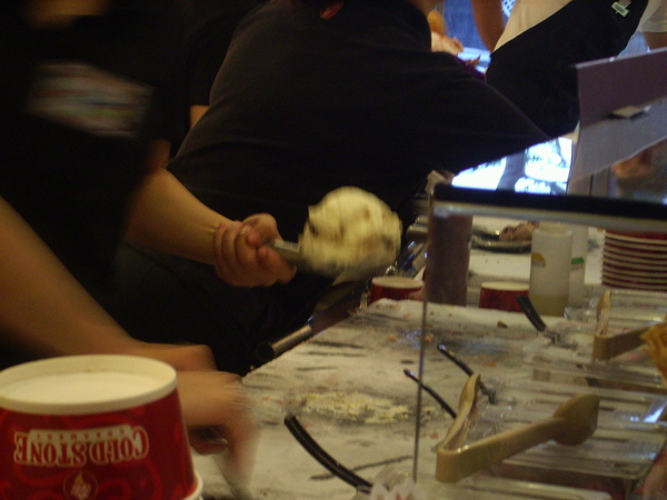 逛阿逛,看到Cold Stone買一送一,在大家都沒有吃過的前提下,於是我們又被吸引了。吃冰去~ 其實冰淇淋不會說很冰,主要是因為和配料攪拌,將配料鋪在冰上,然後用器具快速地攪呀攪,請看下圖。