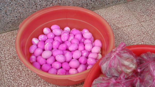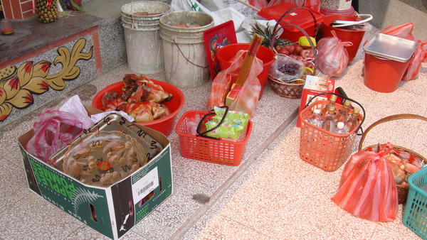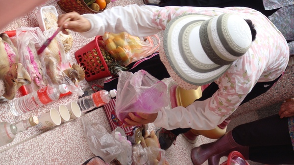 我們自己準備了可食紅色的染料,有些牲醴沒有染,JUNO媽就為他們擦個顏色。