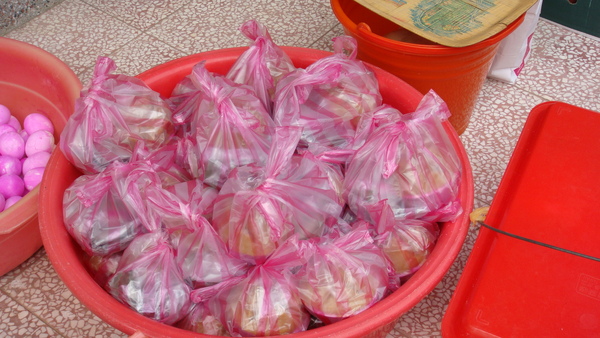 蛋是結束後要分送給大家吃的,一包一包的裡面是新丁仔和發粄,一戶一袋。