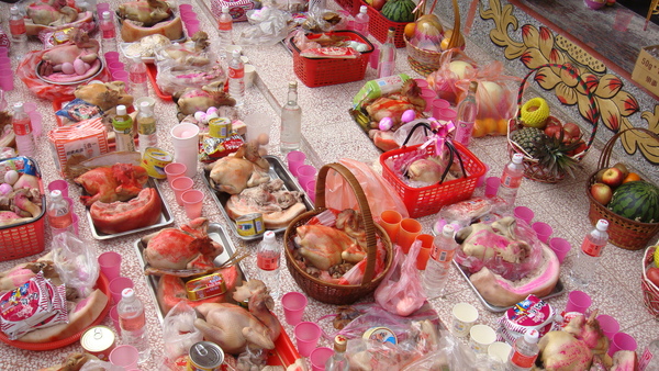 每戶一付牲醴,有紅通通的感覺是吧,因為祭拜的雞、豬肉、蛋都會染色,酒杯也要用紅色的,所以用紙杯的都被換成了紅色杯子了。