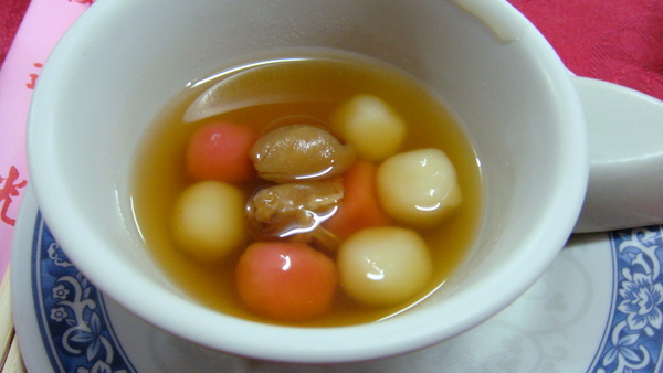 晚餐到了很熟悉的飯店開桌,目的是感謝親戚們的幫忙,第一道菜是湯圓,取其圓滿之意。