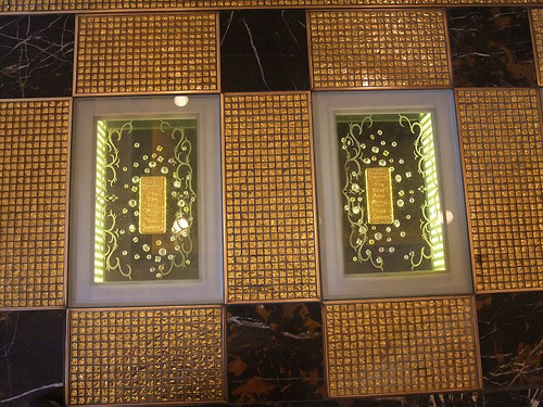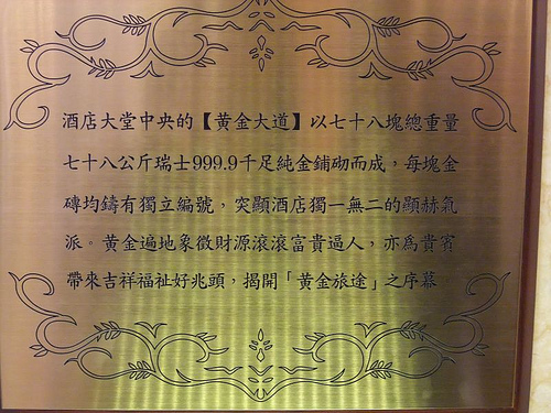 英皇娛樂酒店大堂中央的「黃金大道」以七十八塊總重量七十八公斤瑞士999.9千足純金鋪砌而成,每塊金磚均鑄有獨立編號,突顯酒店獨一無二的顯赫氣派。(資料來源:英皇) 這就是英皇的特色。