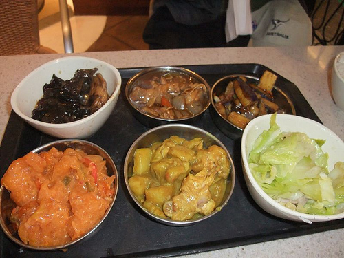 考量方便性,晚餐遂在威尼斯人裡面尋找,果然美食廣場區的食物都超貴,看來看去只有這個比較便宜,像自助餐一樣選兩道菜,另有一杯飲料,一人份MOP39元。