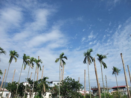 這是美濃的天空,剛好遇到不錯的天氣,那些斷掉的、沒斷掉的椰子樹是隔壁人家的。開工第一天超忙碌的,都快要慌了手腳,晚上還要加班。為了犒賞自己,絕對拿出BYEBYE送的7-11集點券,到星巴克買一送一去。2010年第一杯飲料就是星巴克的焦糖星冰樂,有沒有很讚! 好喝唷~推薦!希望之後的事情都很順利進行,也要趕快成為公務員,才有全羊大餐可以吃啊!
