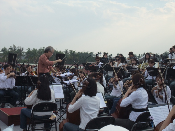 指揮好辛苦,要一直和頗刺眼的夕陽奮戰,都不能遮,但他應該不怕曬黑啦。