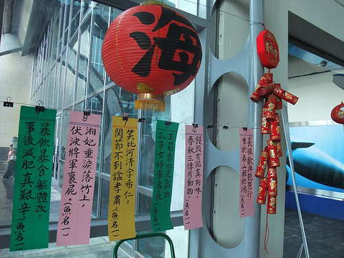 元宵將近,似乎有猜燈謎的活動,請看最左邊的燈謎,「事後減肥真艱辛」雖然不知道這是什麼魚,但過年增加的體重留在身上卻是個不爭的事實(挺)。