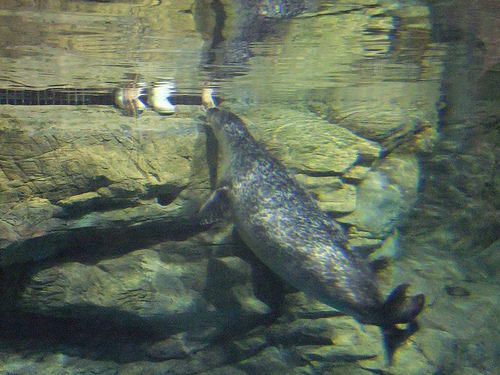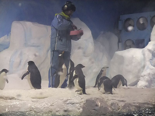企鵝走路晃呀晃的,游水卻很自在,剛好看到企鵝餵食秀。
