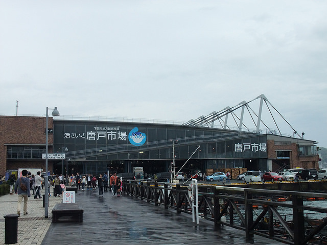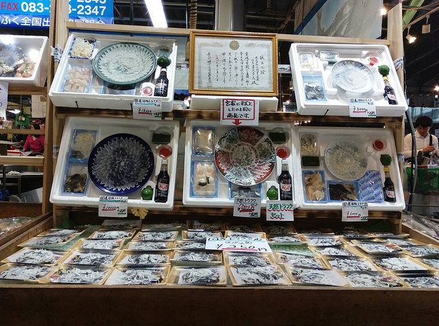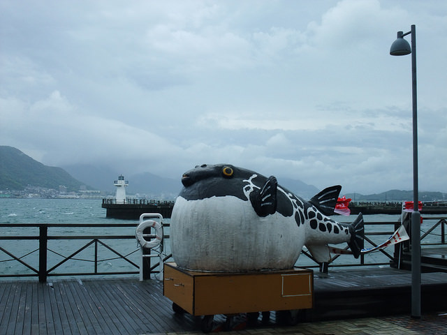 搭公車來到唐戶市場,這裡的代表物是河豚,所以隨處可見河豚商品、河豚公共藝術等。