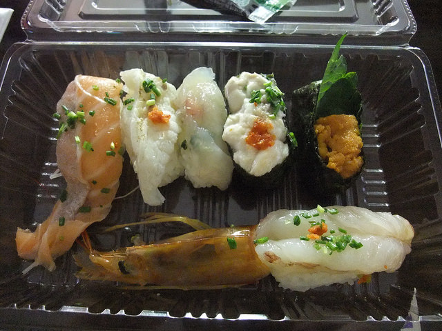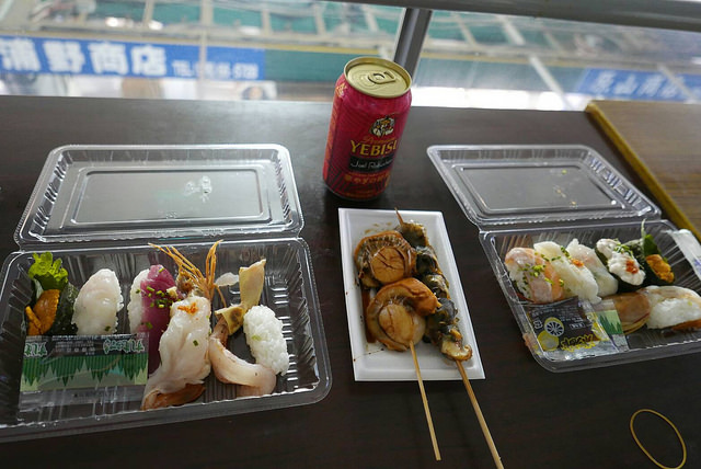 來到市場當然要吃海鮮,選擇想吃的握壽司搭配啤酒和河豚湯,海鮮真的很鮮啊!如果沒有下雨,就可以在港邊愜意的看海吃海產,好可惜。