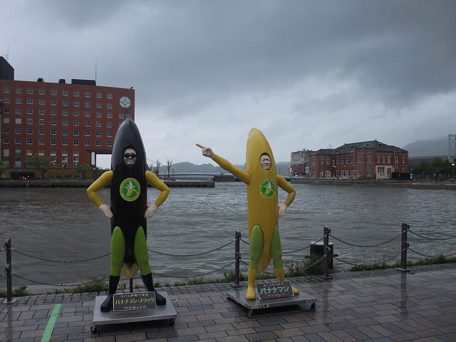 著名的香蕉人,來到這裡一定要來合影。早期門司港以進口香蕉為主,所以才有這兩尊香蕉人的出現,黃香蕉的表情很北七。