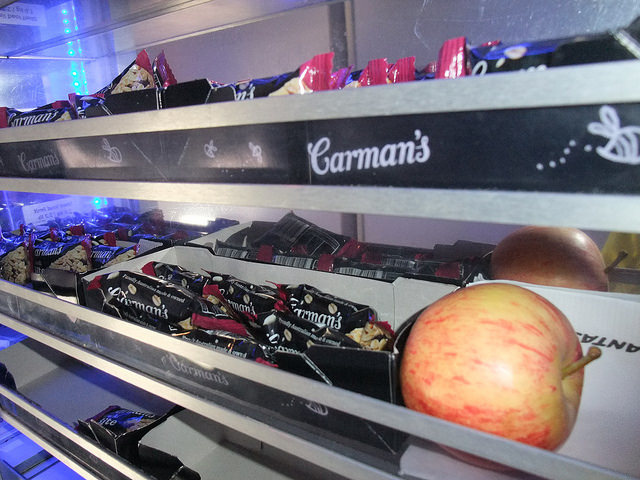 機艙後端備有零食區,其實也只有巧克力餅乾、蘋果,旅客要是大半夜餓了,可以自己去拿來吃,因為半夜是沒有提供機上服務的。