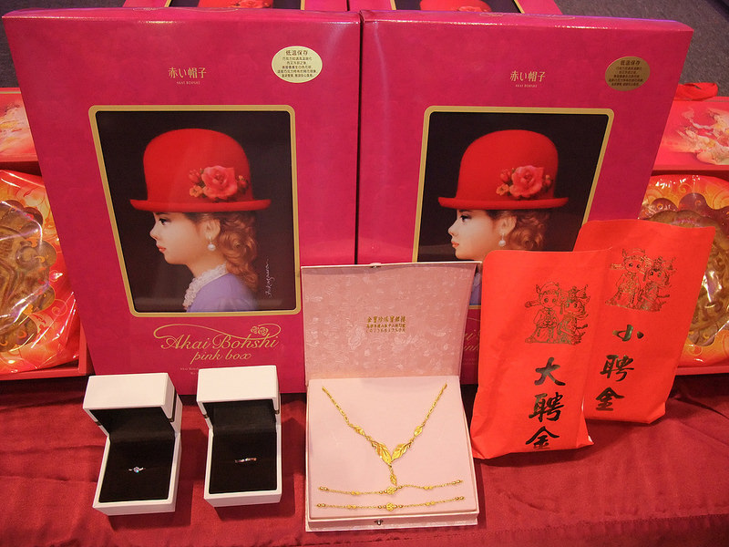 擺了喜餅和項鍊、手鍊、戒指、禮金等的長桌。