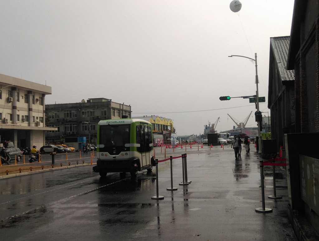 原本時速15公里,因為有點下雨又開得更慢,大概10公里,旁邊有輕軌經過的時候還不能發車,似乎會受到干擾。