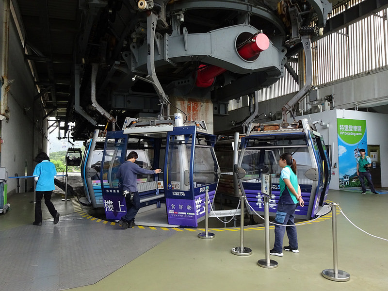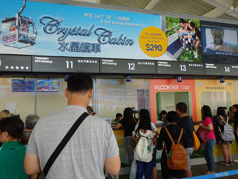 纜車票可以先上Klook網站買,話說Klook上有許多票券,比到現場買還便宜,而且先買會比較方便。到達纜車站後先到窗口換實體票券,節省許多排隊購票的時間,雖然搭上纜車還是得再排隊。這次只搭單程纜車,因為下個行程要到大澳漁村,再回來搭纜車不方便。我們是搭標準車廂,不過排隊等待時觀察到搭水晶纜車的人也不少。