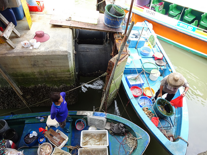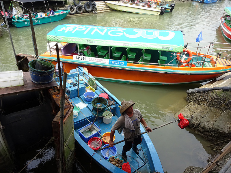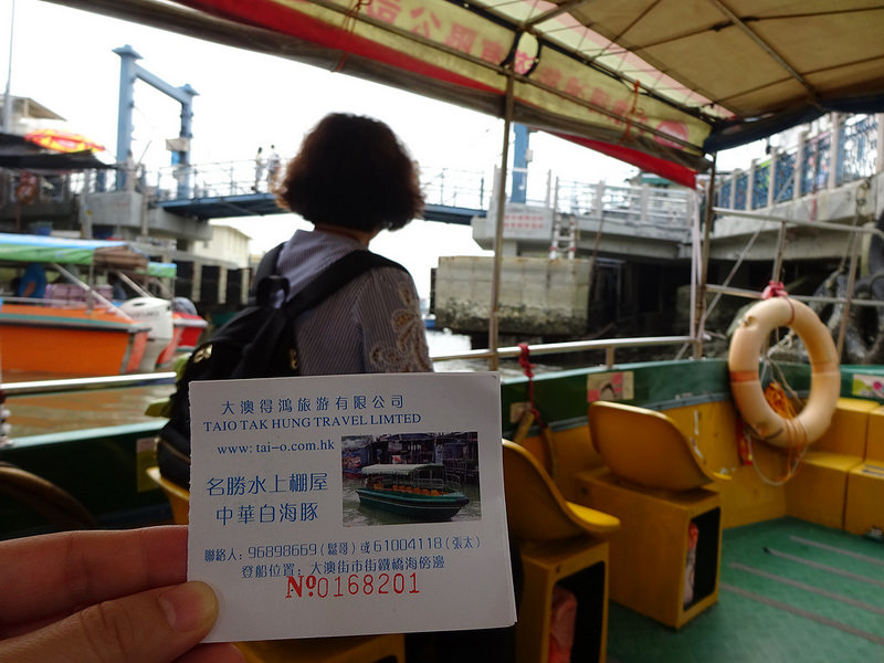 大澳有許多船家在招攬搭船看中華白海豚和棚屋的遊程,其中一間票價從原本的30元降價到20元,鼓吹我們搭乘,嗯,好吧!那就搭吧!搭乘舢舨小艇在水道中穿梭,可以近距離欣賞棚屋,也可以到近海看看白海豚。