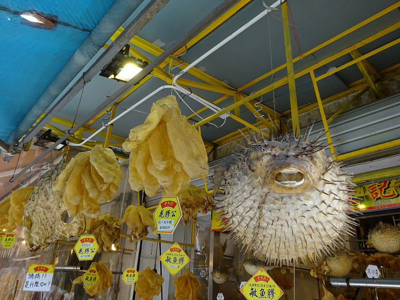 到處都賣海鮮乾貨、鹹魚、花膠,果然是漁港,下圖右邊河豚渾圓的身體,感覺有在生氣喔。