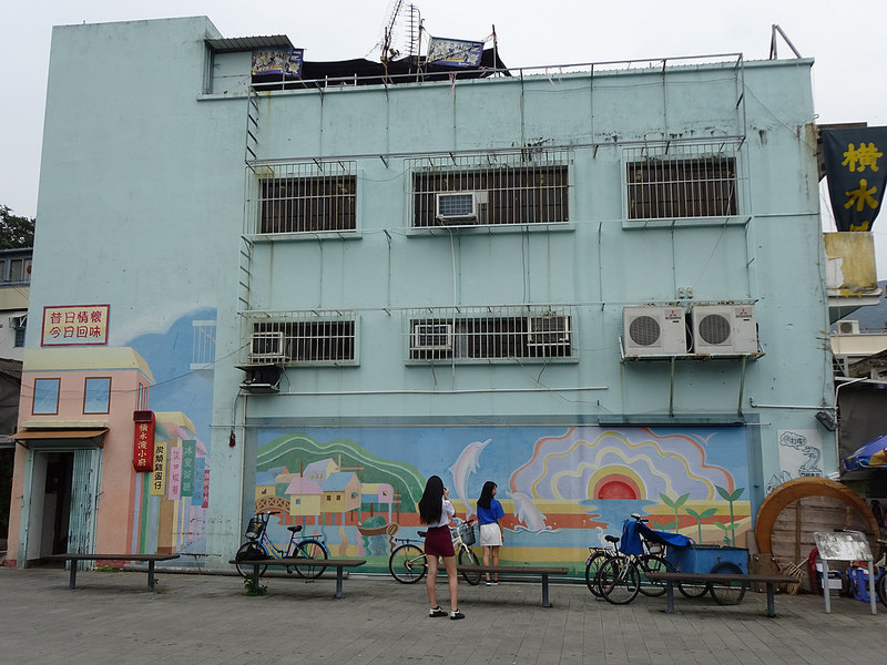 在關帝古廟前的建築物牆上有大澳漁村的景點與特色-棚屋、白海豚,很適合IG打卡,就像照片中的美眉那樣。