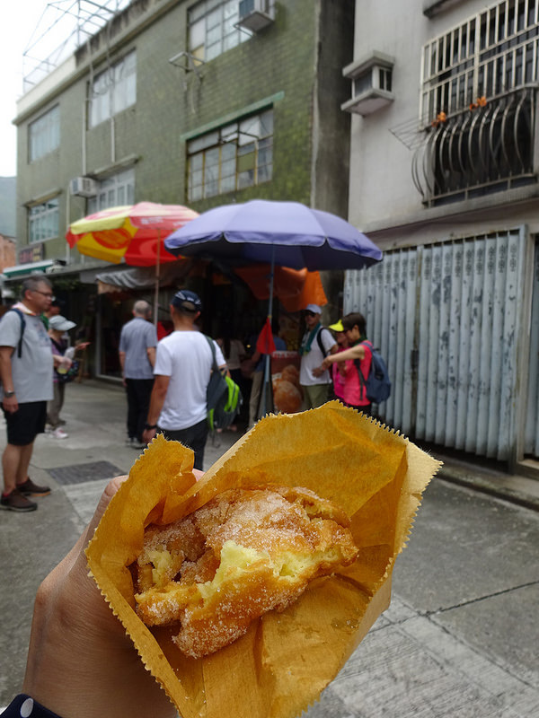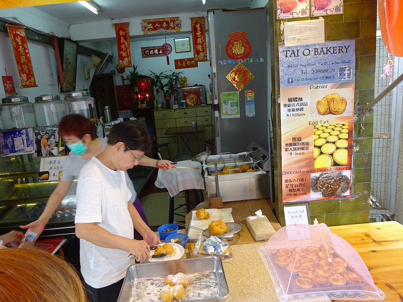 「大澳金門餅店」有現做的沙翁,經過的遊客大部分都會停下來買,雖然需要排隊,但是不會等太久。將雞蛋、油及麵粉混合而成的麵糰炸好後沾上糖粉,馬上就裝袋給客人了,要小心熱騰騰的沙翁可是很燙口的。沙翁很像台灣的「雙胞胎」,但是更綿密鬆軟,一口咬下,蛋香十足,是此趟香港行吃到最好吃的沙翁,可以列為大澳必吃美食!