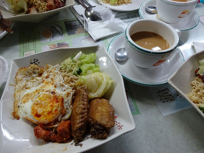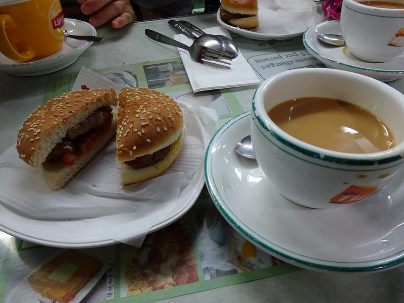 蘭芳園的豬扒包和澳門的不同,中間夾了片番茄,兩地的豬扒包各有不同的風味,再來杯絲襪奶茶或鴛鴦奶茶,很有港式風情。