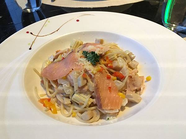 主菜選擇檸檬酸奶燻鮭義大利麵,鮭魚給的大方,還有健康的玉米筍和胡蘿蔔,份量十足。