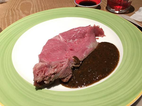 牛排一定要試一下,這份肋眼牛排看起來只有三分熟,但用低溫熟成的方式烹調,不會有血水滲透,搭配黑胡椒醬品嘗,肉質挺嫩的。