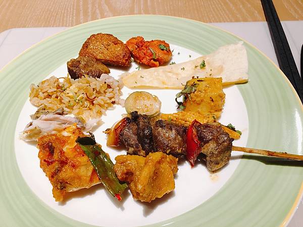 客人不多,走道寬敞,比起其他間自助式餐廳桌椅總是擺滿的情況,這樣的用餐空間較為舒適。或許正是因為客人不多的原因,所以菜色也不多,生魚片看起來不吸引人,若想專攻生魚片的人,或許可選擇同樣位於9樓的京享日式自助餐廳。生蠔除了有新鮮的,也有用蒸的,味道還可以,雖然海鮮吃的不多,但JUNO對海鮮不怎麼感到驚豔,港式料理也少,在素食區有看到一個燒賣,雖然不是港式餐廳,但港式燒賣不是一般自助餐廳的必備項目嗎?雖然如此,但異國風料理的菜色卻比想像的多樣,例如各種咖哩、印度烤餅、新加坡口味螃蟹、串燒等,如下面這張圖。