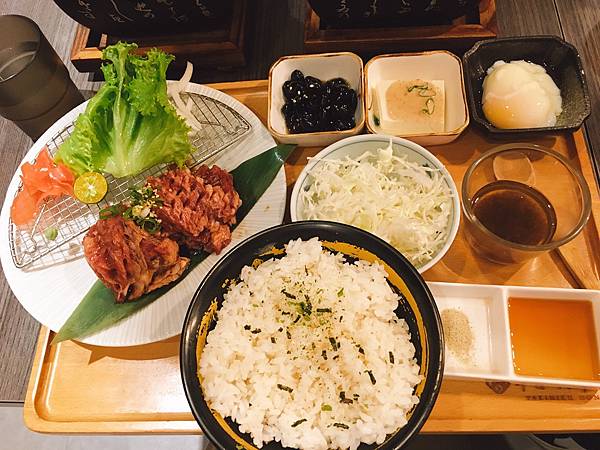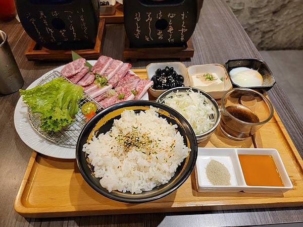 友人想試試日本A5和牛有沒有很厲害,於是點了厚切和牛燒肉大佬定食,另外也點了特上羽下肋眼牛排定食和炙燒安格斯黑牛後腹肉丼(+90元升級套餐),飲料都喝桂花烏龍茶,想說吃那麼多肉要喝無糖的茶水比較好。