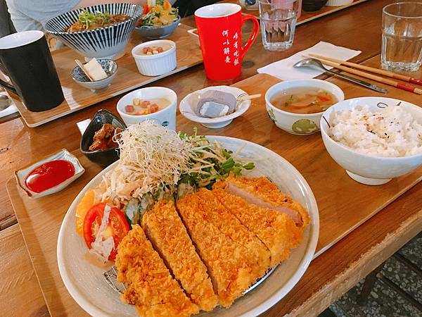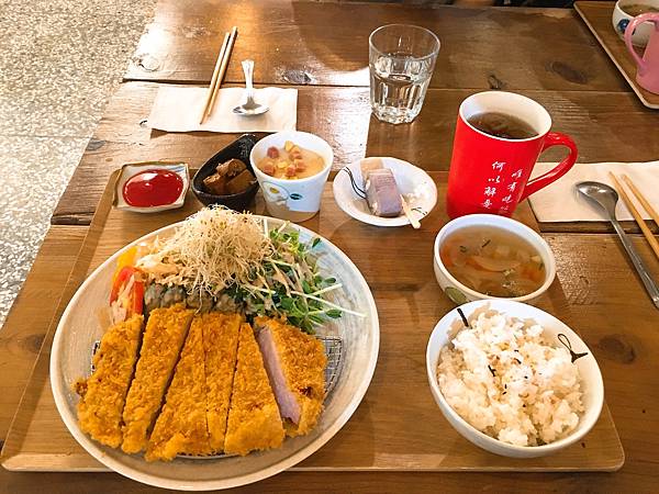 餐點一上桌差點被嚇到,這份量也太嚇人,除了切成六塊的大豬排,還有的青菜、湯、甜點、滷味、蒸蛋,紅茶、白飯,老闆真的不怕客人吃,尤其很難得看到會給這麼多青菜的套餐,我們忍不住懷疑青菜是不是老闆自己種的。強烈建議份量可以再少一點,吃不完有點浪費。