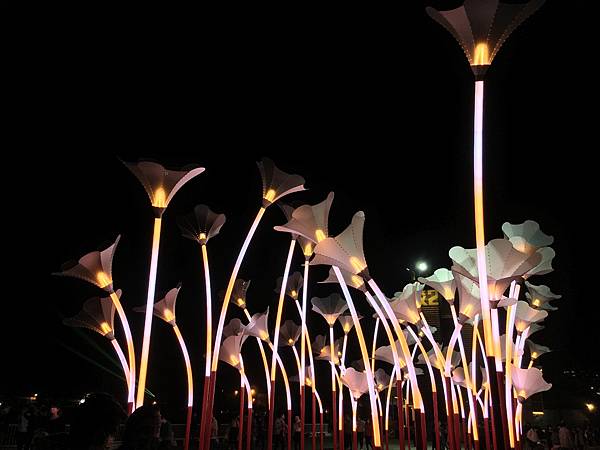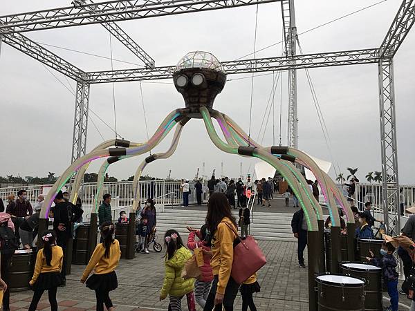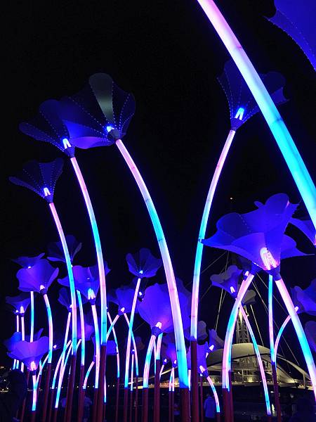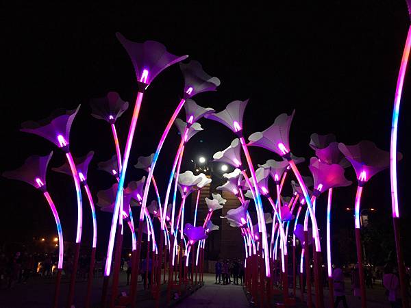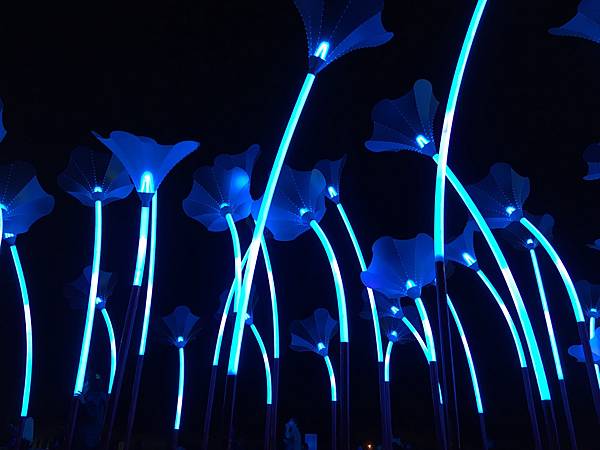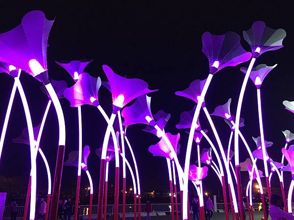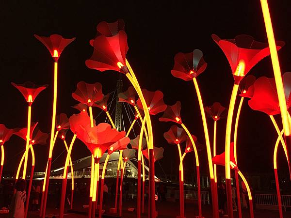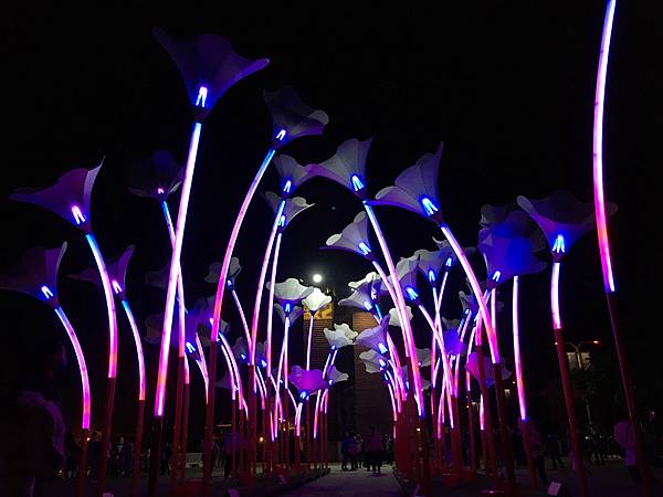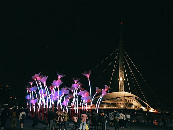 下一個前進的地點就是最近很熱門的打卡點,也就是駁二大港橋前面的「巨人的夢幻花園」。因2022台灣燈會在高雄,最近開始了很多燈光或光影的展示,「巨人的夢幻花園」就是其中一個,由54朵比人還高的巨型喇叭花組成,還會隨風搖曳變色。