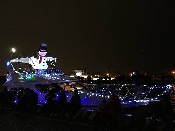 好幾艘遊艇也掛上小燈泡,其中下面這艘還直接把雪人請來了。