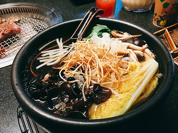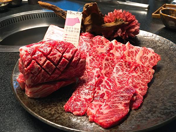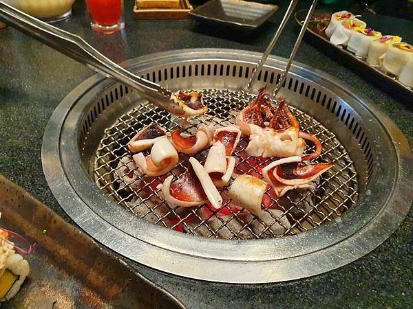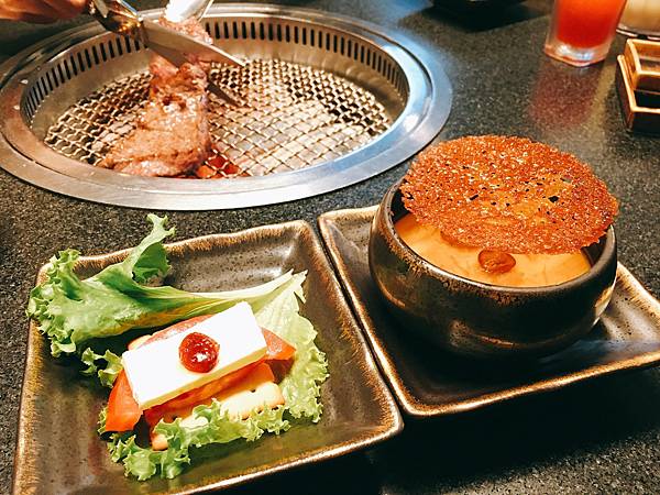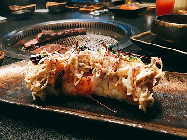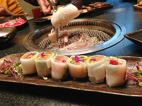 元旦只能選擇單點和極味之選燒肉組合,特殊節日只能選擇比較高單價的,不過用餐人數還是很多,生意很好。首先,主菜來個海芙牛帶骨牛小排吧!果然是好看又好吃的牛肉,油花不會太多,魚子醬花壽司的搭配飽嘴又美味,漬蘿蔔鮮魚捲沙拉更是爽口,醃漬的白蘿蔔將鮮魚包覆起來,很有創意的組合與口感,是很有記憶點的一道菜。