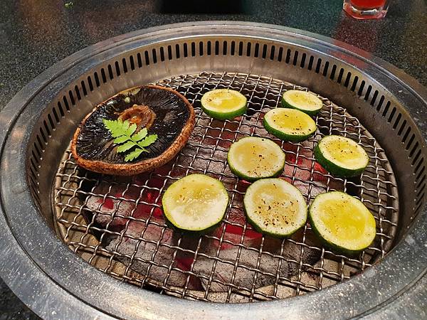 很大一朵波特菇,烤過之後有它自然的味道,而且很多汁,櫛瓜稍微烤過後可單吃或者和肉類一起吃。