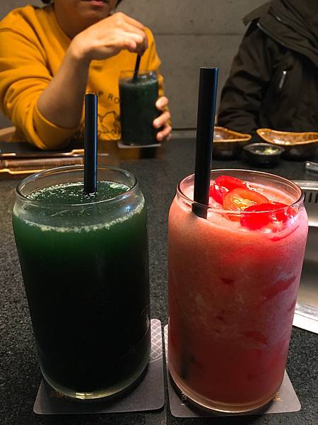 紅與綠的飲品頗有聖誕樹的感覺。藍藻檸檬蜜喝起來很順口,別看顏色這麼綠,但喝起來一點都不奇怪。紅色的飲料忘了名稱是什麼,喝起來有點像水果冰沙,裡面還有寒天可以嚼嚼嚼。