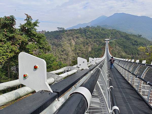 全長262公尺,離地高度約45公尺,為全國最長的吊床式吊橋。往下看,可以看到舊時的吊橋,溪床沒有半滴水,只看見幾台假日休息中的怪手。