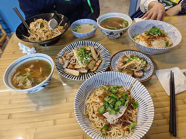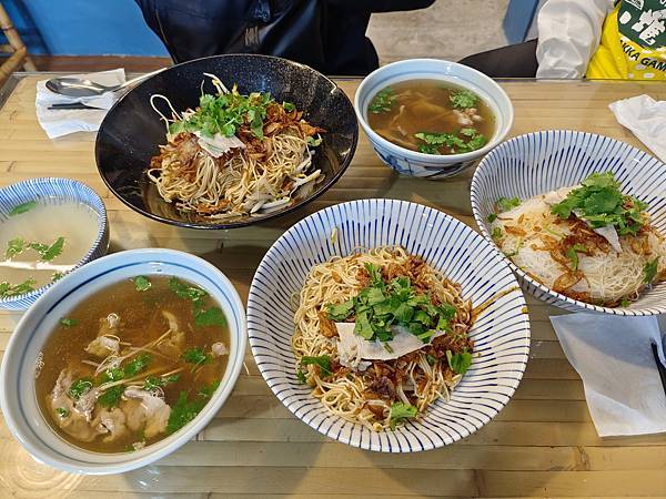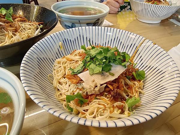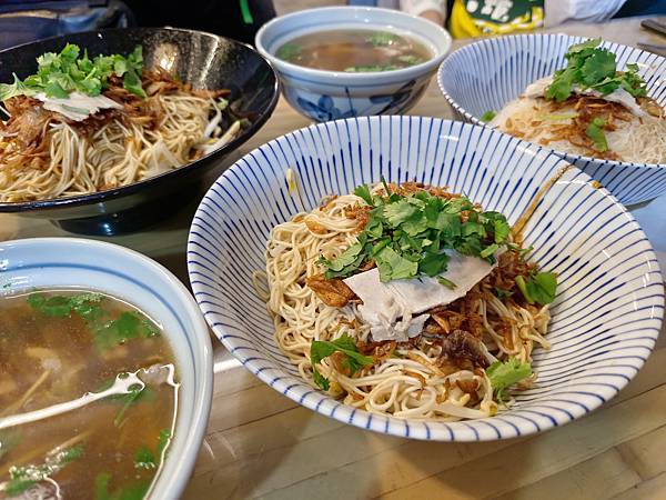 乾麵上灑上油蔥酥、香菜、豆芽菜,鋪上肉片,加了一點麻醬、蒜末,味道融合得很好,調味彼此不搶鋒頭,若稱之為一般的乾麵就小看它了。乾麵有附清湯,不過若來碗阿婆的瘦肉湯,更是加分,舒服的湯頭加上薑絲提味,不油膩的肉片增加咀嚼感,令人極為滿足。