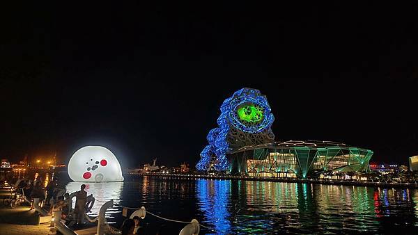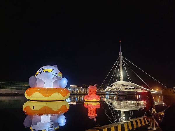 為了彌補姪女沒看到的遺憾,隔天星期一晚上再度前往,平常日少了遊客,人潮確實少了很多,可以舒服的看最近很紅的這六隻Line貼圖明星-無所事事小海豹、貓爪抓、ㄇㄚˊ幾兔、豆卡頻道、PP mini 小小企鵝、塔仔不正經。說真的,Juno對這些角色根本不熟,純粹跟風拍照。因為這幾個大型充氣裝置藝術分散各處,說遠不遠,說近也不近,建議搭配輕軌可以輕鬆一點。