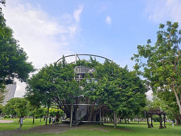 往駁二方向行走,大義公園內除了有大型裝置藝術「椅子樂譜」,最近還多了同一位藝術家的創作「大樹宇宙-愛河森林慢板」。