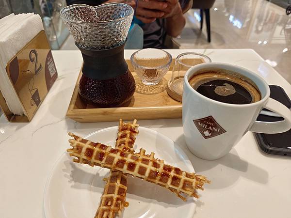 經典美式咖啡還附兩根焦糖鬆餅捲,咖啡份量還不少唷!