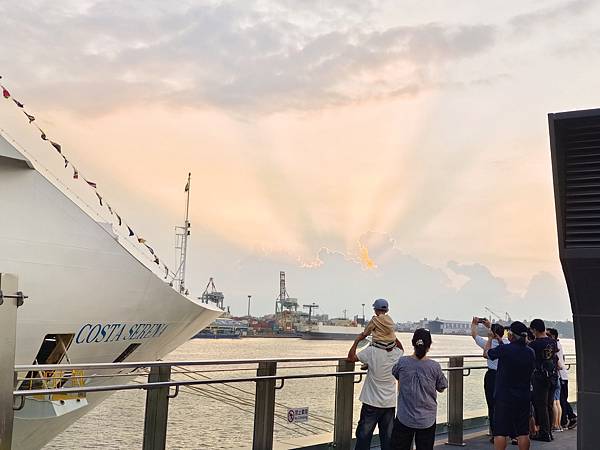 3樓的海韻藝術廣場(觀景平台)可以近距離欣賞到這艘11萬噸的郵輪,碰巧看到夕陽將雲朵勾勒出漂亮的線條。