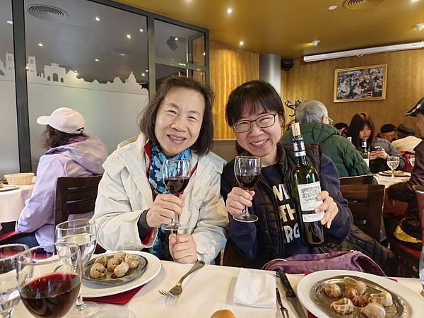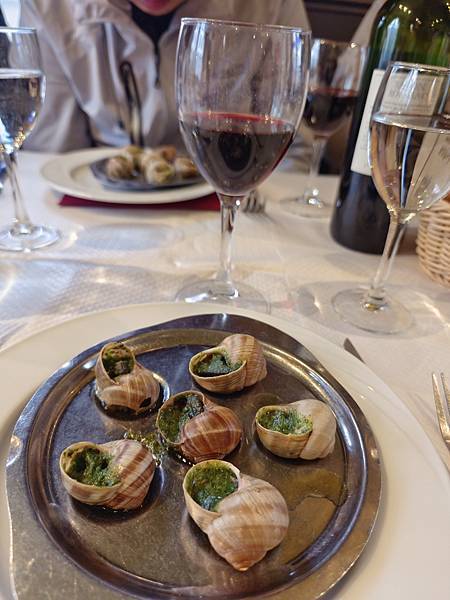 午餐在巴黎歌劇院附近的Chez Edouard吃法式烤田螺、主菜、蘋果派,以及四人一瓶佐餐酒(紅酒)。
