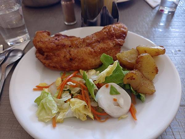 ▲主餐魚排與簡單的配菜,炸魚排滿好吃的。