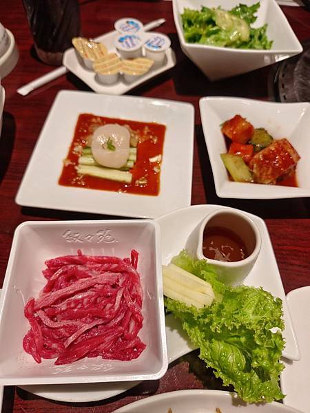 ▲左上:生食級干貝;右上:黃瓜泡菜;上方:沙拉;下方:生牛肉刺身