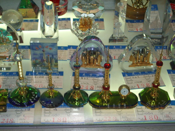 話說參觀東方明珠電視塔的這天竟然下雨,所以儘管從這麼高的建築物往外看,卻什麼也看不見,只好看裡面賣的紀念品囉。鏡子上標示著方位與一些城市,例如從南方這個方向698公里處就是台灣的高雄了。